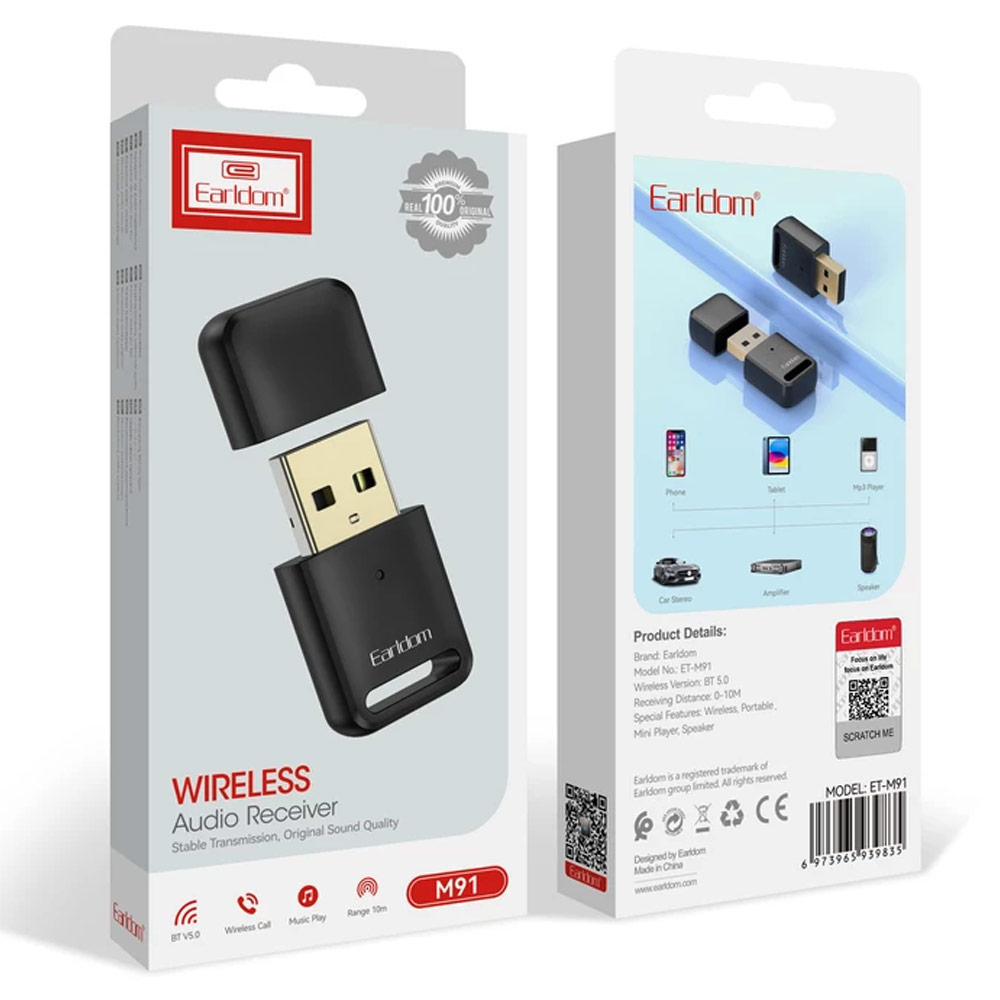 دانگل بلوتوث Earldom مدل ET-M91 با نسخه بلوتوث ۵، برد ۱۰ متری، طراحی پرتابل و قابلیت تبدیل دستگاههای صوتی به پخشکننده بیسیم؛ مناسب برای اسپیکر، ضبط ماشین و هدفونهای سیمی.