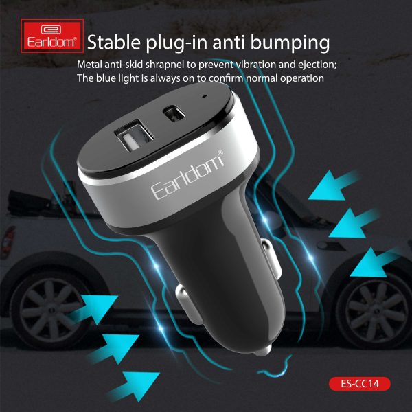 شارژر فندکی Earldom مدل ES-CC14 انتخابی کاربردی و اقتصادی برای شارژ سریع گوشی‌های هوشمند و لوازم دیجیتال در خودرو است. این شارژر با دارا بودن دو پورت خروجی USB و USB-C، توانایی شارژ هم‌زمان دو دستگاه را با جریان خروجی 5V/2.4A دارد.