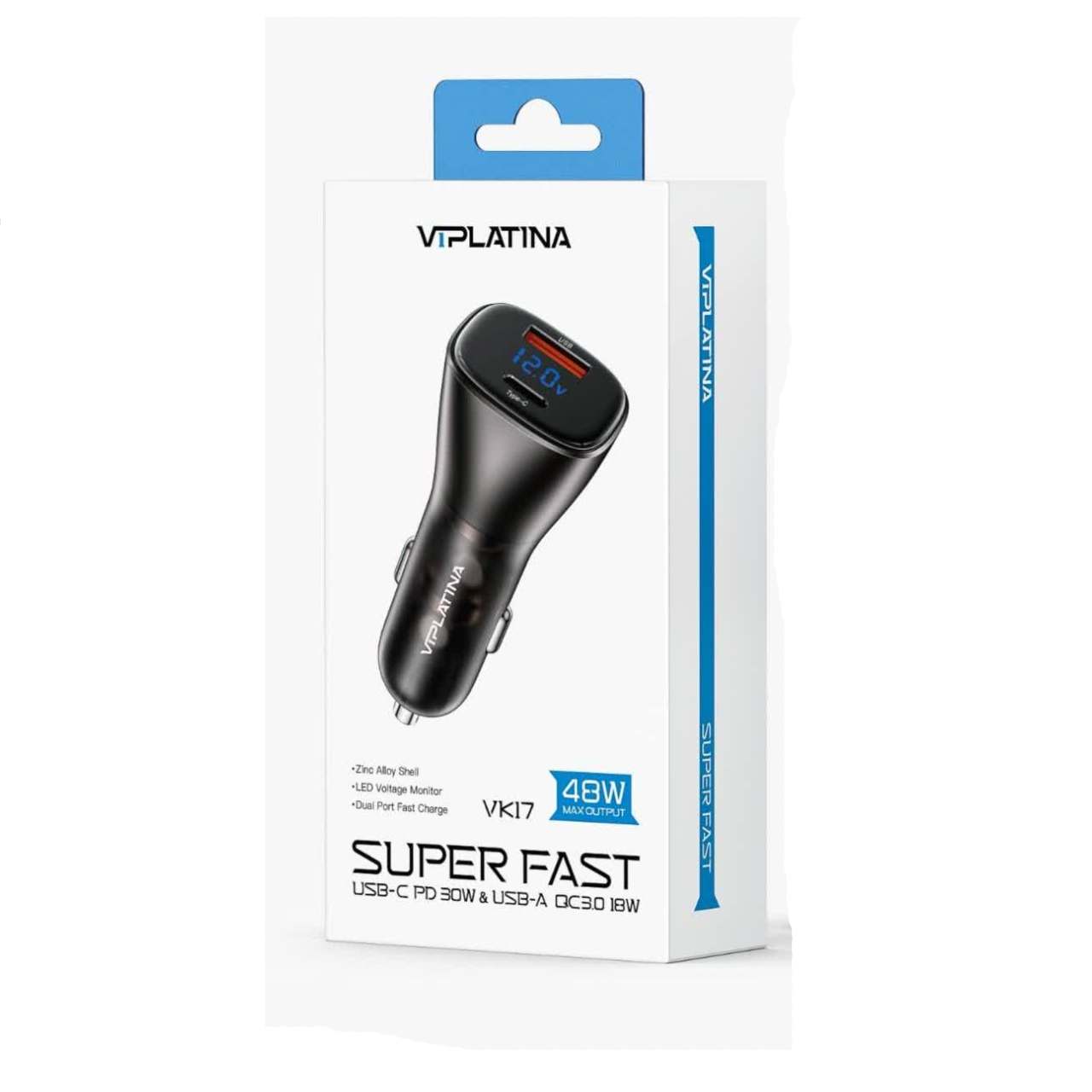 شارژر فندکی VIPLATINA VK17 یک شارژر قدرتمند و باکیفیت برای خودرو است که با بدنهای مقاوم از آلیاژ روی (Zinc Alloy) + PC ساخته شده است. این شارژر با پشتیبانی از استانداردهای فست شارژ مختلف، توان خروجی 48 وات را از طریق دو پورت USB-A و USB-C فراهم میکند. همچنین به نمایشگر LED ولتاژ مجهز است تا وضعیت برق خودرو را به شما نشان دهد.