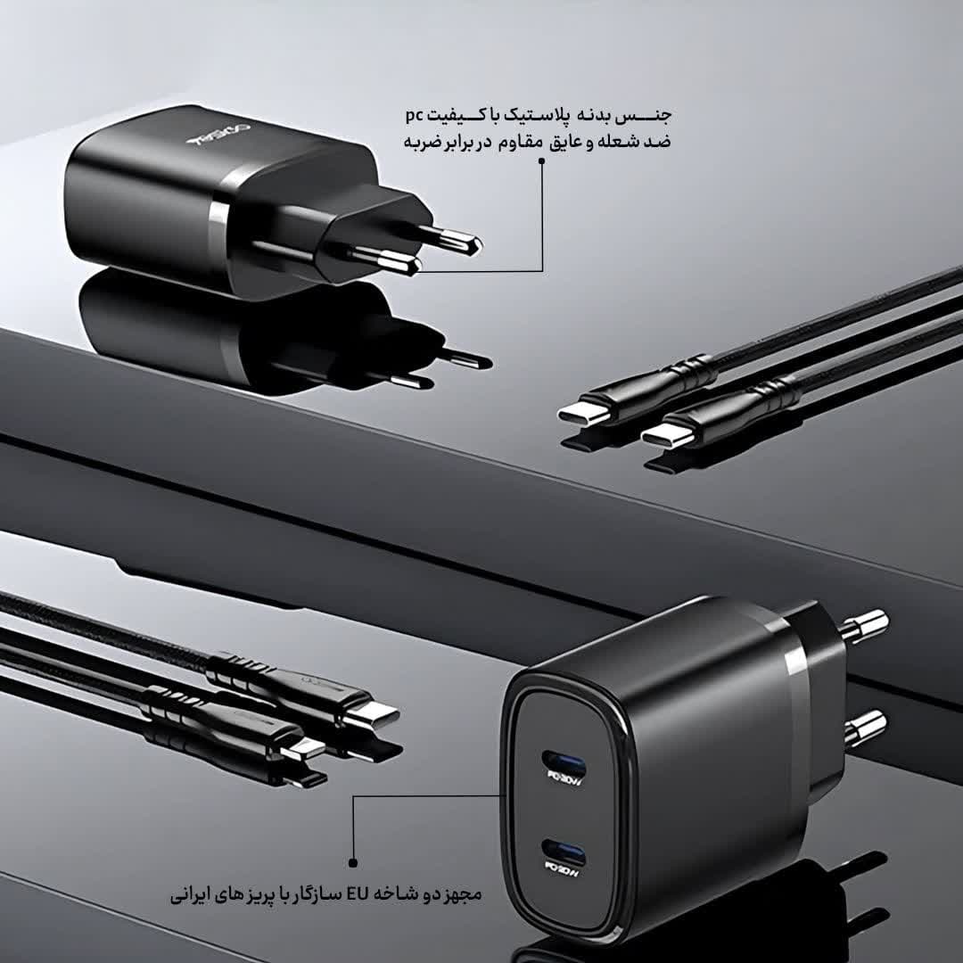 این شارژر دارای دو خروجی Type-C (C+C) است و میتواند با توان کلی 20 وات (20W Max)، دستگاه شما را با سرعتی ایمن و بدون آسیب به باتری شارژ کند.به همراه این شارژر، یک کابل کنفی مقاوم و بادوام نیز ارائه میشود که در برابر کشش و خم شدن مقاوم بوده و عمر طولانیتری نسبت به کابلهای معمولی دارد.