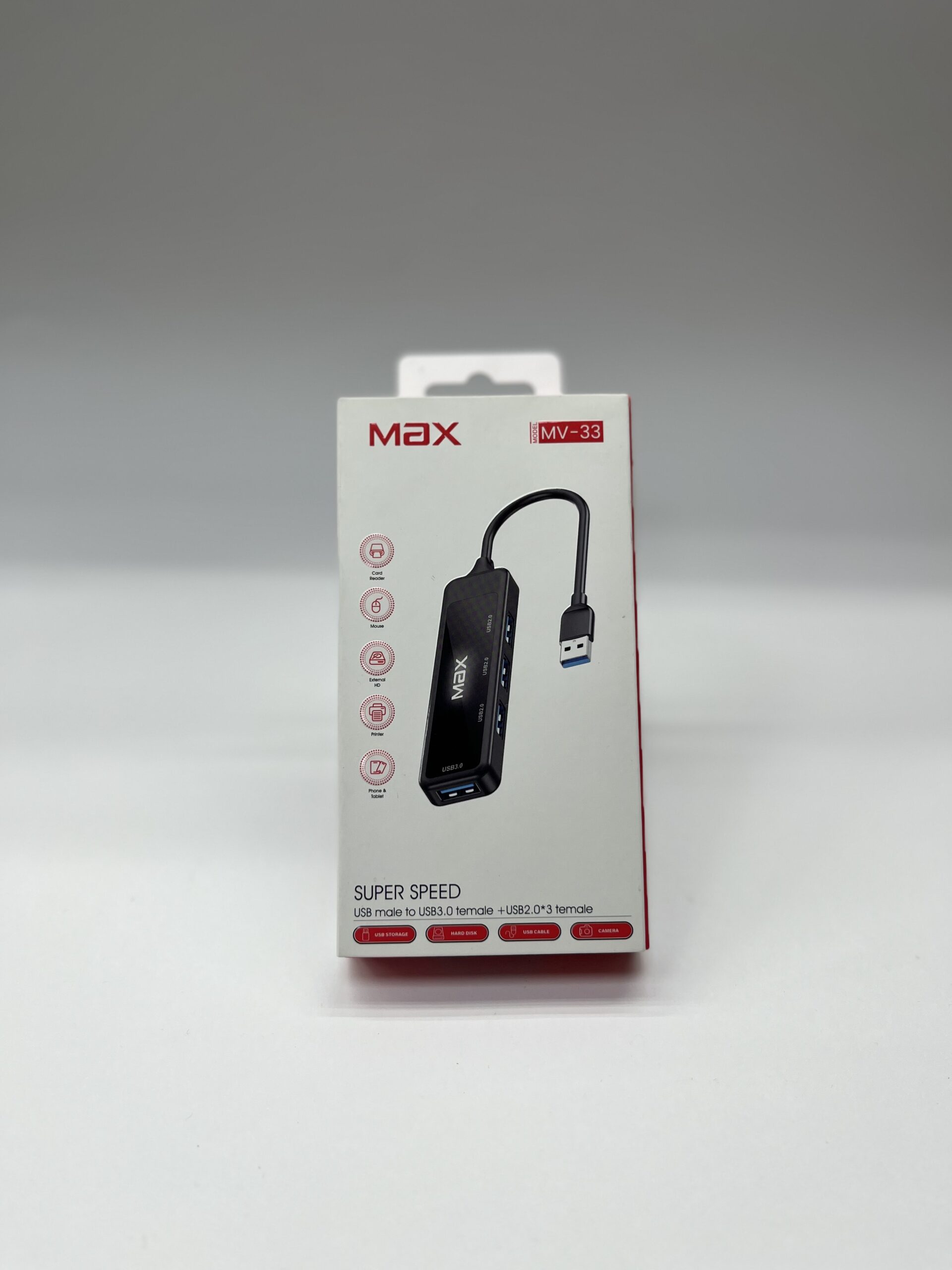 هاب USB مکس مدل MV-33 با یک پورت USB 3.0 و سه پورت USB 2.0، امکان اتصال همزمان موس، کیبورد، هارد اکسترنال، پرینتر، موبایل و کارتخوان را فراهم میکند. طراحی جمعوجور و سازگاری بالا برای کاربری روزمره و حرفهای.