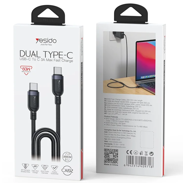 کابل Yesido CA192 یک کابل قدرتمند و باکیفیت برای شارژ و انتقال داده است که با طول 200 سانتیمتر طراحی شده تا راحتی بیشتری هنگام استفاده از گوشی، تبلت و سایر دستگاههای دارای پورت USB-C فراهم کند. این کابل با پشتیبانی از Fast Charge تا 3A، سرعت بالای شارژ و انتقال دیتا را در اختیار شما قرار میدهد.